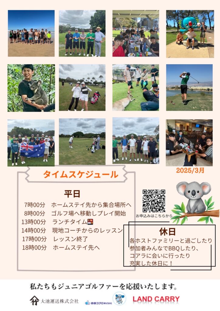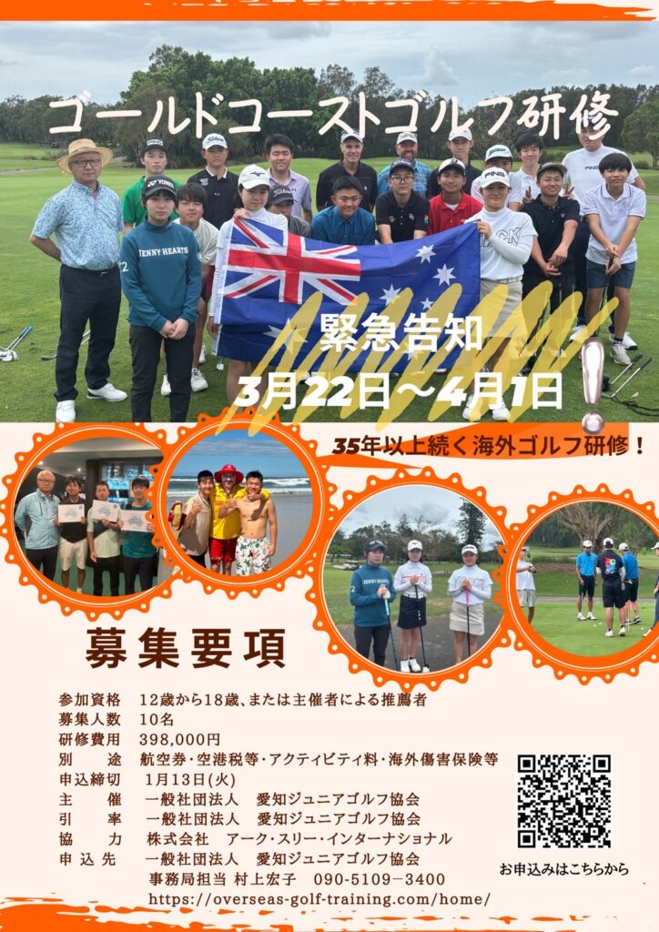 投稿日: 2025年12月1日2025年12月3日 投稿者: 海外ゴルフ研修令和8年度 ゴールドコーストゴルフ海外研修のお知らせ 左のQRコードから申し込みください。申込期間は、2026年1月13日まで 募集要項はこちら