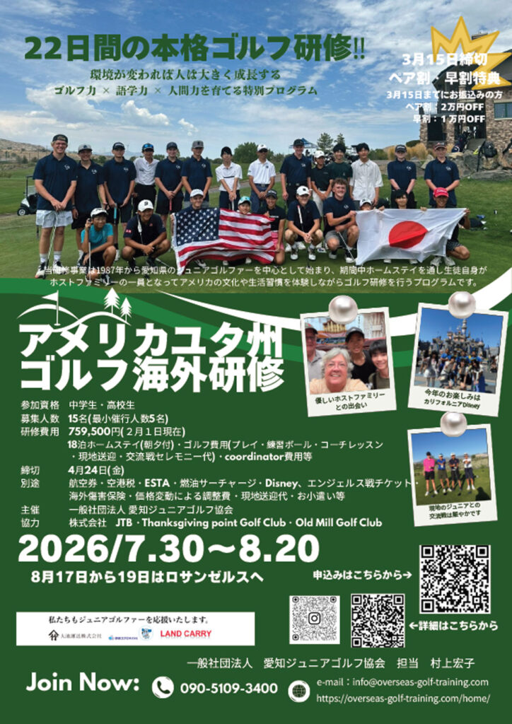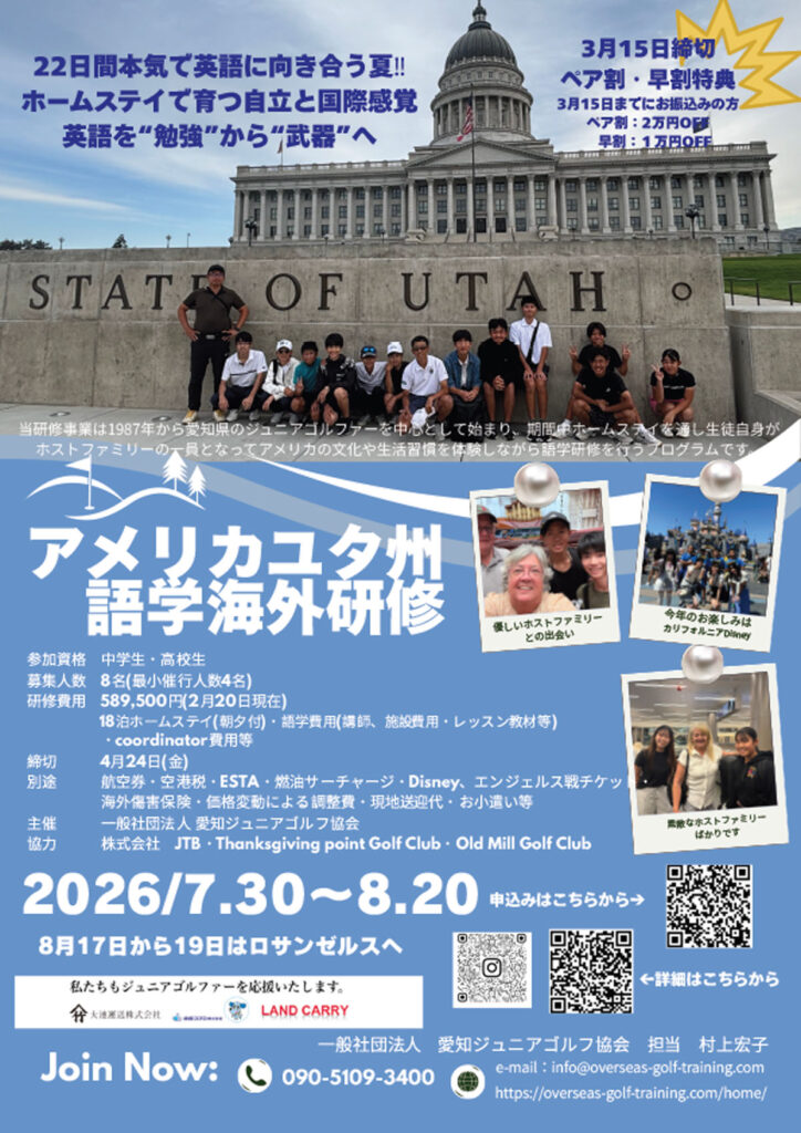 当研修事業は期間中ホームステイを通し生徒自身がホストファミリーの一員となってアメリカ文化や生活習慣を体験しながらゴルフ研修を行うプログラムです。研修内容はPGAプロ及びインストラクターによる多彩なレッスン、ビデオでスウィングを徹底的にデータ分析しブレないゴルファーを目指します。ラウンドレッスン中はルール …